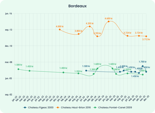 Herunder ses prisudviklingen på markedspladsen for Chateau Figeac 2000, Chateau Haut-Brion 2016 og Chateau Pontet-Canet 2009.