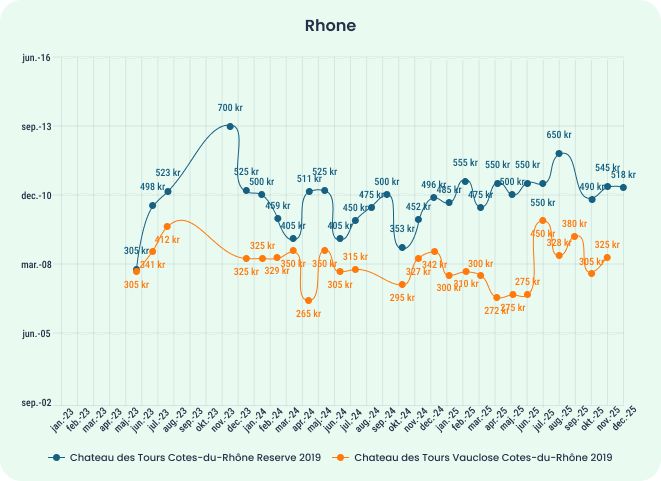 Herunder ses prisudviklingen på to cuvéer fra Domaine des Tours