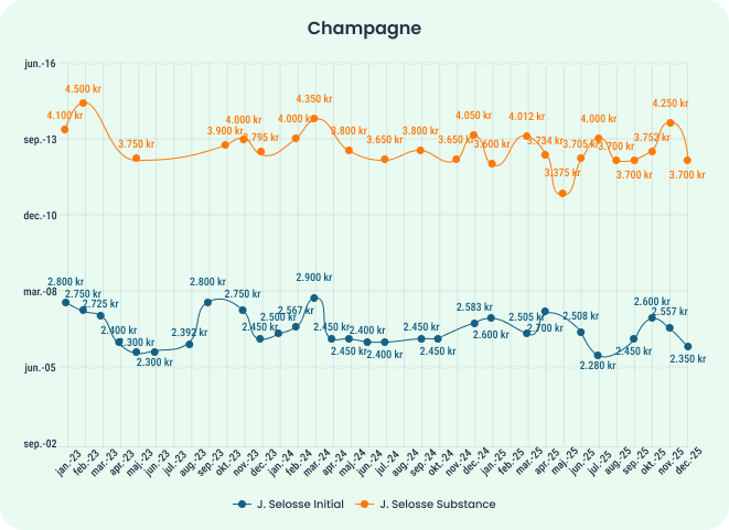 Prisindekset Champagne50 fulgte samme tendens som mange af de øvrige indeks, med fald i første halvdel af året og stabilisering i anden halvdel af året.